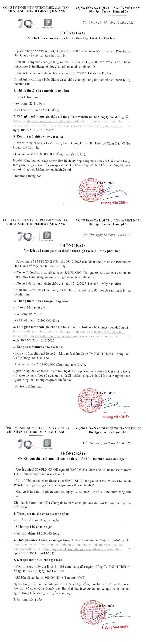 Thông báo kết quả chào giá mua tài sản thanh lý